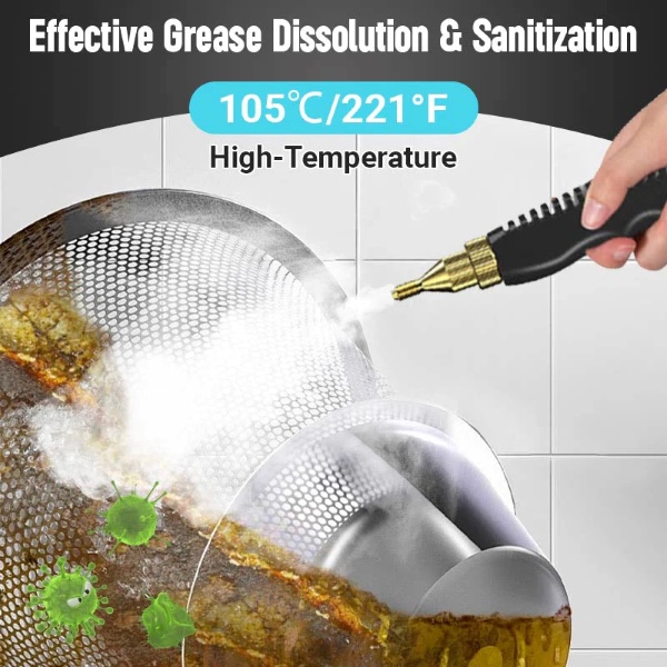 Номиналната мощност от 2500W генерира пара до 105℃ за по-малко от 10 секунди, като бързо премахва мазнини, замърсявания, прах и петна от различни повърхности.