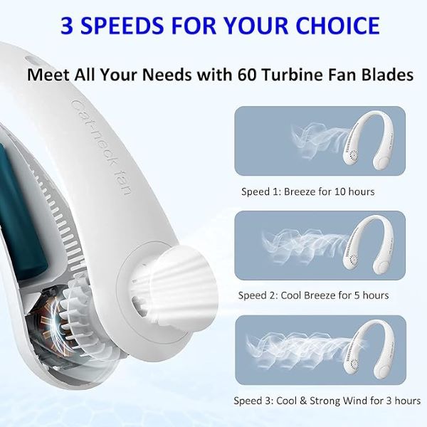 Изработен от ABS материал и мек силикон, този вентилатор за врата се отличава с 360° гъвкава конструкция за въртене,