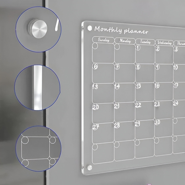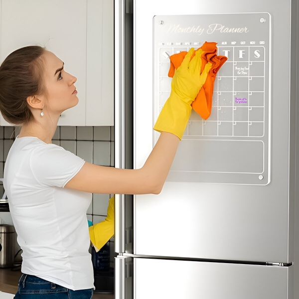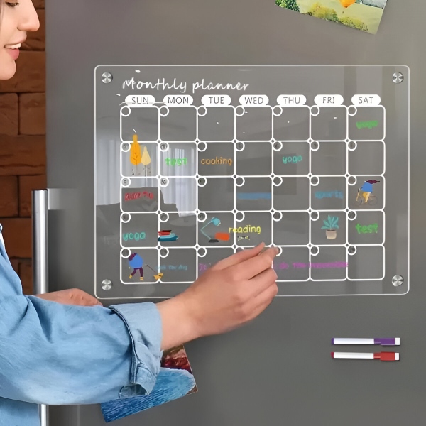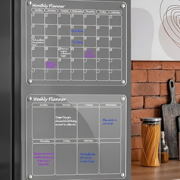 Неговият елегантен, прозрачен акрилен дизайн не само добавя модерно докосване към вашата кухня, но и предлага ефективен начин за управление на ежедневните ви дейности.