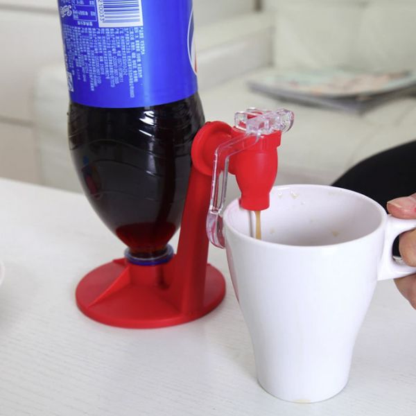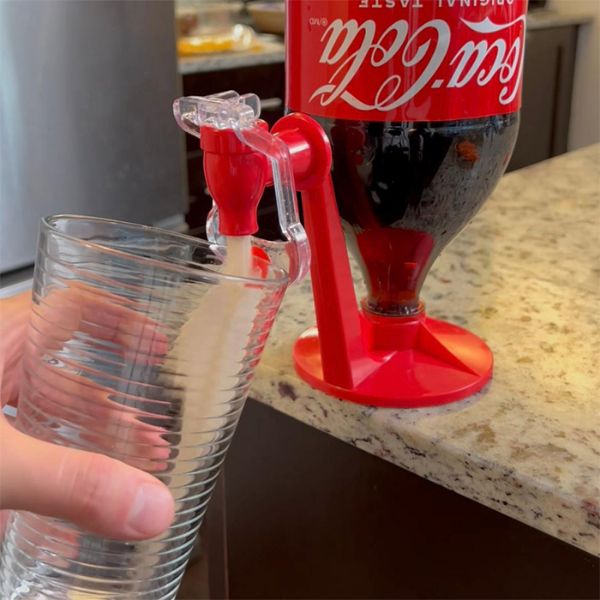 Бавно и стабилно завийте гумения накрайник върху желаната бутилка с напитка и след това бавно я обърнете обратно. Поставете чашата под чучура, от който излиза напитката, и я преместете към прозрачната дръжка. Това ще накара напитката да потече в чашата ви. Когато чашата се напълни, я издърпайте и чучурът ще се затвори автоматично.