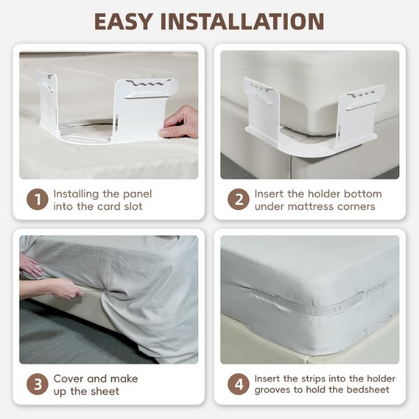 Забравете за металните щипки или пластмасовите кукички – тази система от ремъци захваща плътно чаршафите отдолу, независимо от материала или размера им.