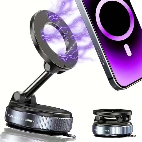 Стойката за телефон MAGHOLDZ използва мощно вакуумно захващане, което се усилва при вибрации, като държи телефона ви стабилно върху гладки повърхности, без да оставя следи по стъкло, табло или бюро.
