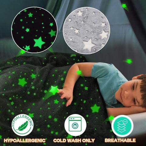 BLANKGLOW! Изработено от луминисцентни материали, това вълшебно одеяло ще издигне съня Ви на галактическо ниво! Луминисцентните материали ще излъчват успокояващо светлозелено сияние през нощта!