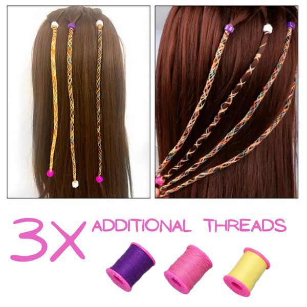 - Опаковката съдържа: 1x уред за сплитане на коса, 12x щипки за коса, 3x конци (жълти, розови и лилави конци), 2x аксесоари за по-лесна употреба.